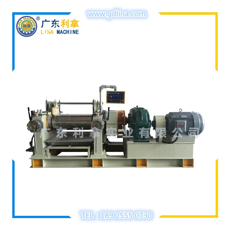 利拿14寸開煉機主要工作部件是兩異向向內旋轉的中空輥筒或鉆孔輥筒,裝置在操作者一面的稱作前輥,可通過手動或電動作水平前后移動,借以調節輥距,適應操作需求;后輥則是固定的,不能作前后移動。兩輥筒大小一般相同,各以不同速度相對回轉,生膠或膠料隨著輥筒的轉動被卷入兩輥間隙,受強烈剪切作用而達到塑煉或混煉的目的.